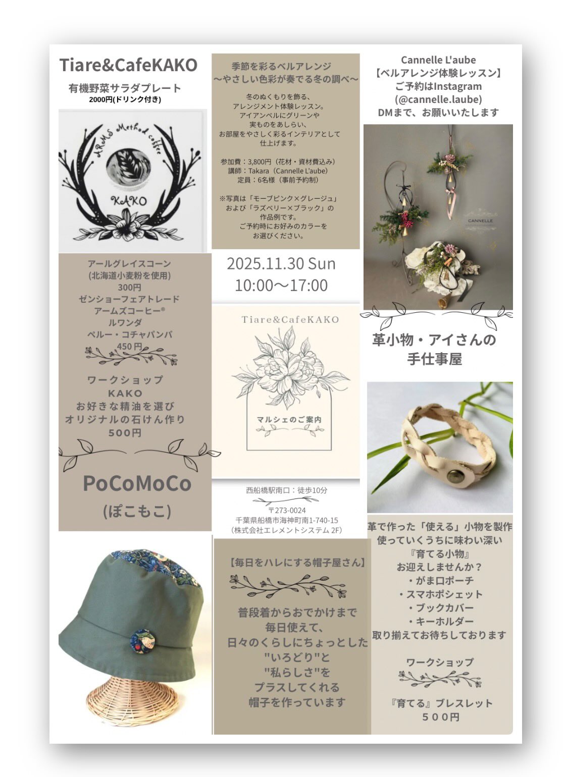 11月30日(日)10:00~17:00で第一回 Tiare&Cafe KAKO マルシェ を開催します!🎉